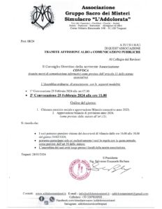 PROGRAMMA EVENTI Associazione Gruppo Sacro dei Misteri Simulacro L’Addolorata dal 14 al 24 Marzo 2024: Sala Laurentina” Via Gen. Domenico Giglio Dal 14 al…